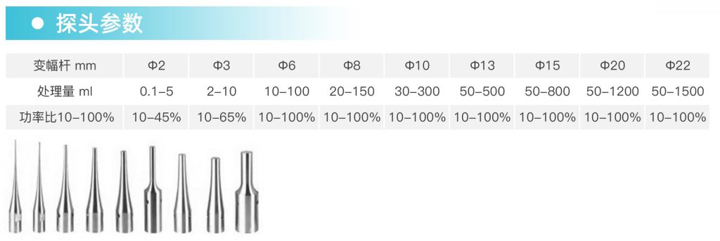 超聲探頭采用美標(biāo)TC4材質(zhì)的高純鈦合金,探頭形狀:錐形、鞭節(jié)形,發(fā)波形式:垂直超聲。
